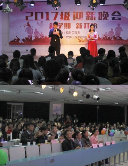 本网讯 流光溢彩迎新夜,心心连新齐飞扬。为了迎接2017级新生的到来,展现软件工程系学子风采,10月15、16日晚,主题为“新学期 新开始”的软件工程系2017级迎新晚会分别在本部大阶梯教室一和丰收佳苑C301、C401教室拉开帷幕。软件工程系主任陈平、党总支副书记王莉娟、副主任陈向东、团总支书记曾甜以及软件工程系的老师和同学们参加了本次晚会。
