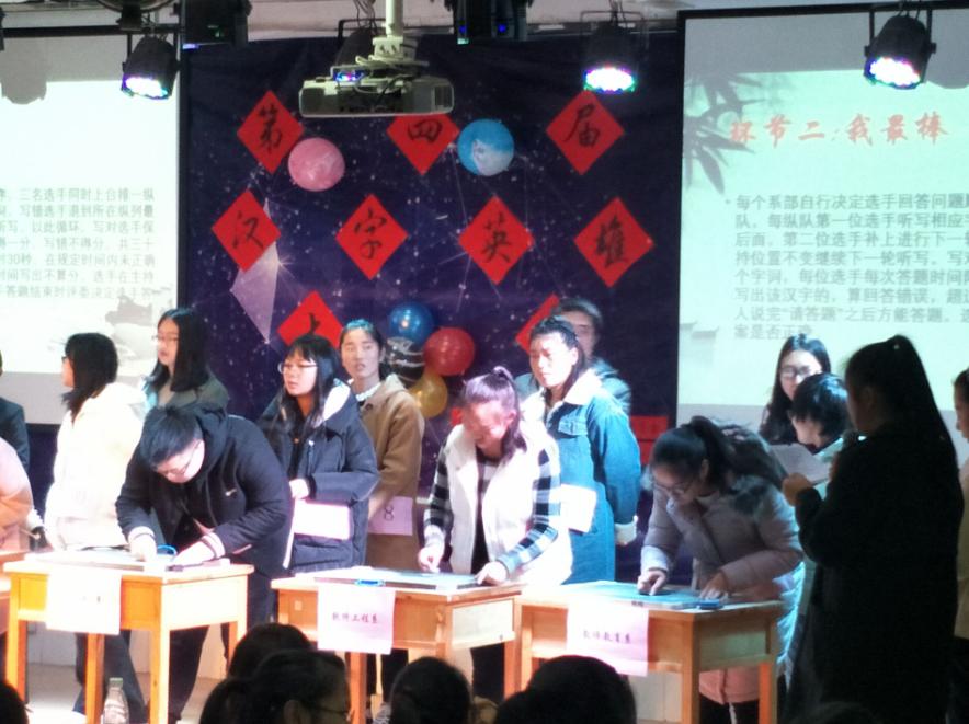 首先,由主持人对本次活动流程进行介绍,之后活动正式开始。比赛共有三个环节:分别是各显神通、我最棒以及我们是大文豪。第一个环节是以看图猜成语的形式进行,比赛开始后,我系参赛选手看到图片后快速思考,积极作答,获得不错的分值。比赛继续进行,第二轮是听写词语的形式,经过上一轮的比赛,台上的同学似乎更加进入状态,题目作答时能更加沉着的应对。比赛进入尾声,最后一轮的文学常识,每位参赛选手都积极地把握最后的得分机会,将自己的能力全部展现了出来。经过激烈的比拼,综合三项得分,我系选手以优异的表现获得了汉字英雄大赛二等奖的好成绩。2017级软件技术(3)班的尹胜男同学也以出色的表现获得了汉字英雄奖。