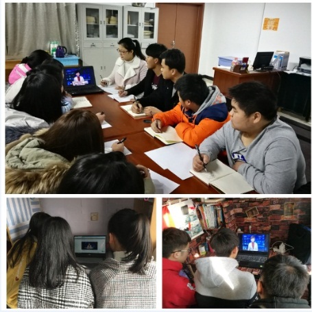 放假回家的同学和老师们采用在家自学的方式观看视频。