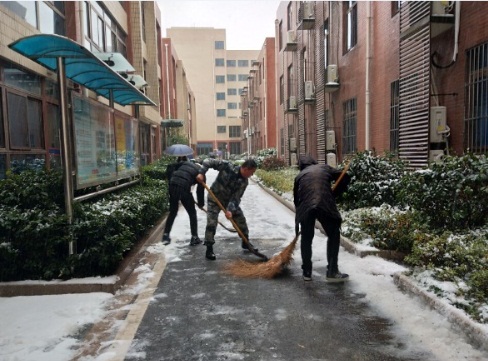 本网讯 近日,软件工程系由秀山校区校卫队自发组织的“爱心扫雪,共创安全校园”的扫雪活动在秀山校区开展。今年的第一场大雪给校园披上银装,皑皑的白雪在带给同学们赏心悦目雪景的同时,也给同学们的出行带来了很大的不便。软件工程系安全员胡军老师迅速组织秀山校区校卫队队员清扫校园内积雪,以确保师生出行安全。