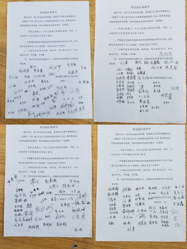 班会中,辅导员为班级同学重点宣传解读了《国家教育考试违规处理办法》(教育部33号令第5至12条和《教育法》)(第79条、第80条)、《刑法(修正案九)》(第25条)中关于考试违纪作弊、涉考犯罪等内容。并再次带领同学们学习了《学生管理制度汇编》中的相关内容。走进2018级移动应用开发班,辅导员李顺顺老师再次向同学们强调了严肃考风考纪、学校规范考试的各项制度以及考试诚信等问题,并结合以往我系发生的关于期末考试中出现的各种问题及处理办法,告诫同学们要严肃对待考试,透明考试、诚信做人。他提到考试仅仅是人生道路上一个小小关卡,若考得好,固然可喜,说明最近学习的效果还可以,知识掌握得也还可以;假如考试结果不理想,也别着急,胜败乃兵家常事,假期在家好好分析一下原因,继续前进,关键要记住“精诚所至,金石为开”。只有注重日常积累,扎扎实实地开展学习,努力形成良好的学习习惯和学习方法,在学习过程中锻炼自己的意志,磨练自己的品质,成功并非是遥不可及的。李顺顺一方面鼓励大家认真复习,在备考过程中放平心态,注意合理运用时间,尽自己的努力取得好成绩;另一方面,他也提醒同学们要用诚信的态度对待每一场考试,考出真实水平,考出诚信学风,不抄袭、不作弊,严格遵守考试纪律,不要将不该携带的物品误带入考场。最后,班级同学都进行了诚信签名,做出承诺。
