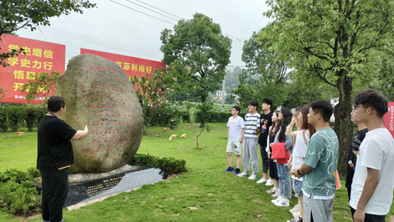 在新四军军部旧址外,显眼的纪念石上刻着《跟着共产党走》词谱,马宇飞老师深情认真的教着同学们唱出这首红色赞歌。