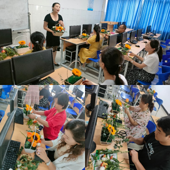 活动邀请专业插花师进行现场花艺插花制作及讲解,老师们学习兴趣高涨,全心投入插花活动中。按照要求修剪花枝、整理花朵、构思扦插位置,相互探讨插花要领和技艺,气氛活跃。看到鲜花在自己手中成型,老师们都非常开心。