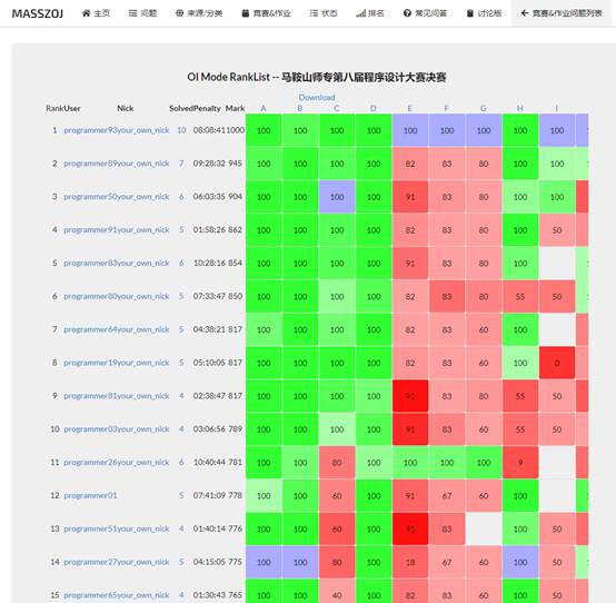 本次大赛分为初赛和决赛两个阶段。初赛阶段,通过近2个月的OJ系统训练,综合OJ系统排名前100名学生和语言类课程老师推荐,选拔出决赛现场赛选手。决赛阶段是以现场赛的方式,通过OJ系统进行比赛,借助OJ系统平台完成赛题的发布、程序的提交和成绩评定。通过比赛角逐,最终评选出获奖情况共计一等奖10名、二等奖20名和三等奖 31名。