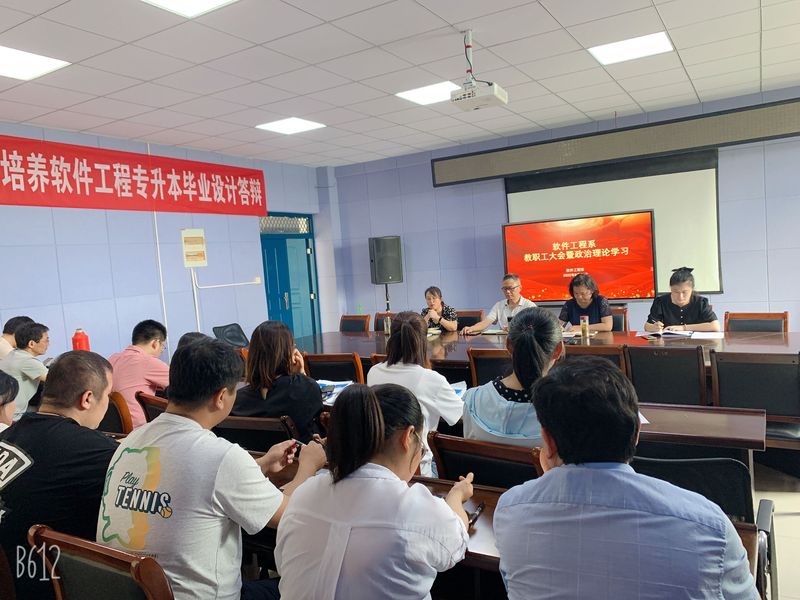 本网讯 6月24日上午,软件工程系在行知楼601召开期末教职工大会暨政治理论学习会。系主任鲁兵、党总支书记王莉娟、副主任杜丹、组织员曾甜出席会议,全体教职工参加会议。
