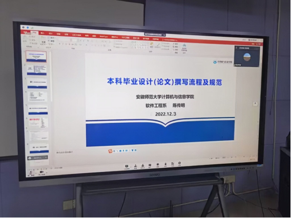 为全面做好2023届本科班毕业设计(论文)工作,让学生了解掌握相关流程规范,12月3日上午,软件工程系在行知楼601举办“本科毕业设计(论文)撰写流程和规范”培训讲座。本次讲座邀请安徽师范大学陈传明副教授主讲,2023届软件工程本科班全体同学参加。